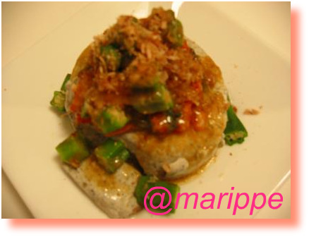 お豆腐の上にはキムチ・茹でたオクラ・かつお節で